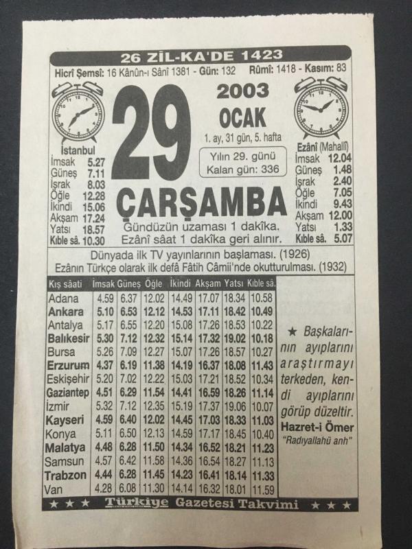 29 OCAK 2003-TAKVİM YAPRAĞI-DOĞUM GÜNÜ HEDİYESİ-TÜRKİYE GAZETESİ TAKVİMİ,DÜNYADA İLK TV YAYINLARININ BAŞLAMASI 1926,EZANIN TÜRKÇE OLARAK İLK DEFA FATİH CAMİİ DE OKUTTURULMASI 1932,, 1 yıl önce satışa sunulmuştur.