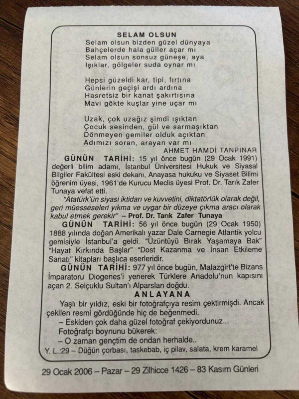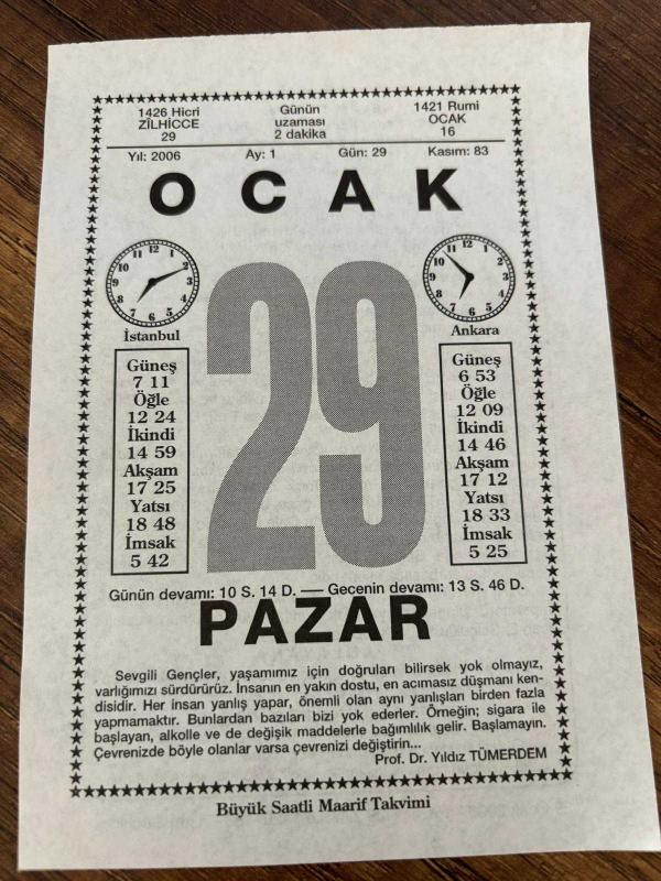 29 OCAK 2006 - TAKVİM YAPRAĞI - DOĞUM GÜNÜ HEDİYESİ - BÜYÜK SAATLİ MAARİF TAKVİMİ - PROF. DR. YILDIZ TÜMERDEM - AHMET HAMDİ TANPINAR - 2. SELÇUKLU SULTAN'I ALPARSLAN'IN DOĞUMU - PROF. DR. TARIK ZAFER TUNAYA'NIN VEFATI, 3 ay önce satışa sunulmuştur.