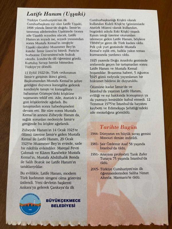 29 OCAK 2008 - TAKVİM YAPRAĞI - DOĞUM GÜNÜ HEDİYESİ - GAZİ MUSTAFA KEMAL ATATÜRK FOTOĞRAFLI BÜYÜKÇEKMECE BELEDİYESİ TAKVİMİ - Latife Hanım'la evleniyor - Latife Hanım (Uşşaki) - 1944- Dünyanın en büyük savaş gemisi Missouri denize indirildi - 1981- Şair Özdemir Asaf 58 yaşında İstanbul'da öldü - 1991- Anayasa profesörü Tarık Zafer Tunaya 75 yaşında İstanbul'da öldü - 2005- Türkiye Cumhuriyeti'nin ilk öğretmenlerinden Saliha Nimet Altınöz, Marmaris'te öldü, 2 ay önce satışa sunulmuştur.