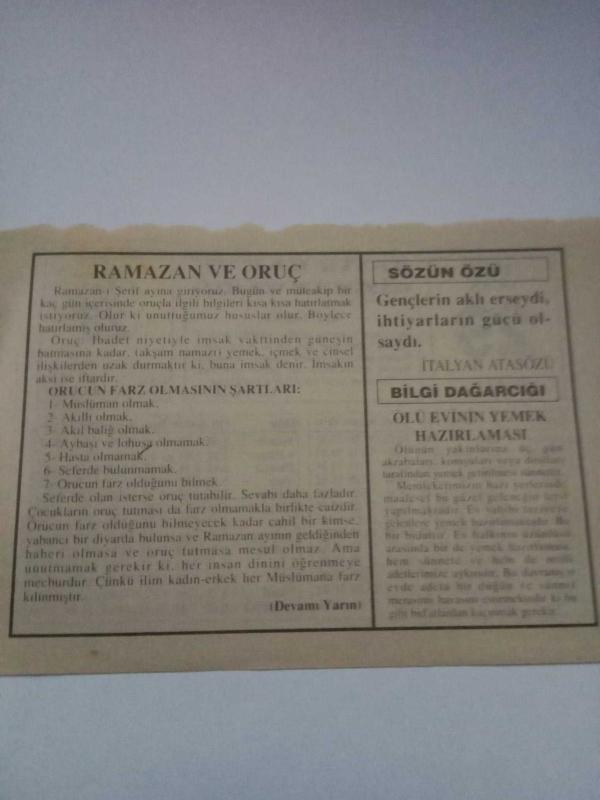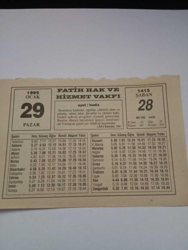 29 Ocak 1995-Orijinal Takvim Yaprağı-Doğum Günü-Söz,Nişan,Nikâh,Düğün ve Önemli Günler Hediyesi-Fatih Hak ve Hizmet Vakfı-Ayet/Hadis(Âl-i imrân:14)-Ramazan ve Oruç-İtalyan Atasözü-Ölü Evinin Yemek Hazırlaması, 6 gün önce satışa sunulmuştur.