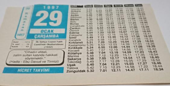 29 Ocak 1997-Orijinal Takvim Yaprağı-Doğum Günü-Söz,Nişan,Nikâh,Düğün ve Önemli Günler Hediyesi-Hicret Takvimi-Ayet(Hadis)-Ebu Davud ve Tirmizi)-İlk Türkçe Ezanın Fatih Camii'nde Okutturulması(1932)-Ramazan ve İtikaf-Peygamberimiz(SAV)-Hikmetler, en son bir ay önce güncellenmiştir.