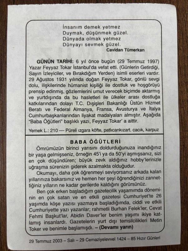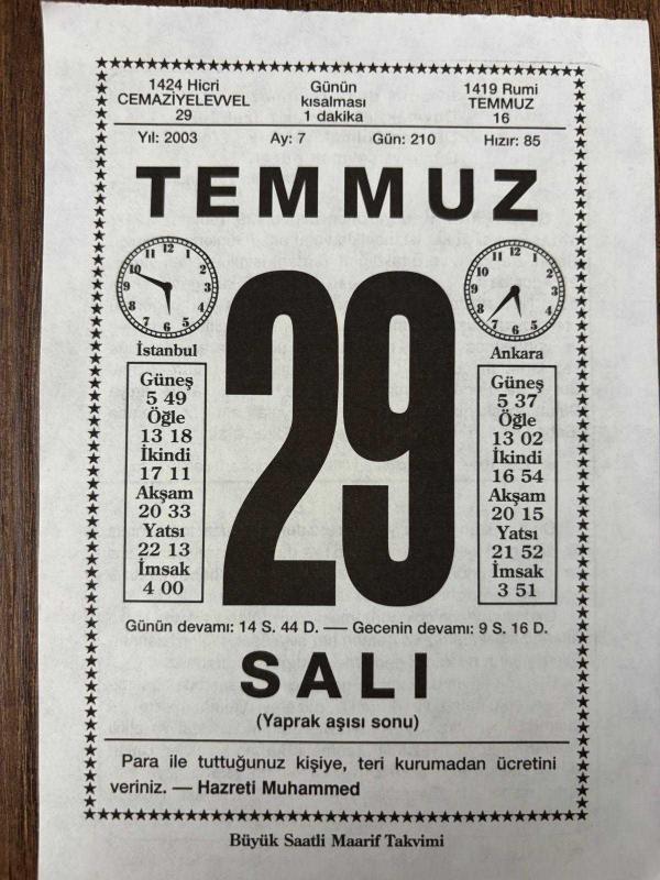29 TEMMUZ 2003 - TAKVİM YAPRAĞI - DOĞUM GÜNÜ HEDİYESİ - BÜYÜK SAATLİ MAARİF TAKVİMİ - HZ.MUHAMMED - CAVİDAN TÜMERKAN - YAZAR FEYYAZ TOKER'İN VEFATI - BABA ÖĞÜTLERİ, en son 8 ay önce güncellenmiştir.