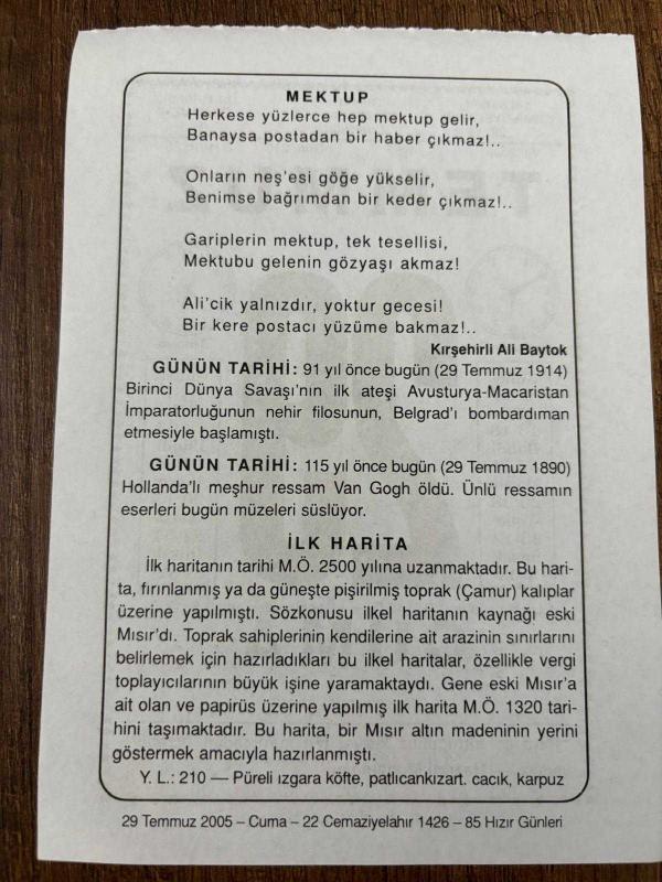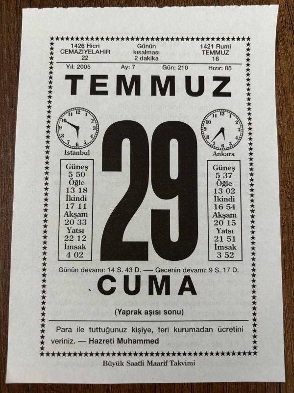 29 TEMMUZ 2005 - TAKVİM YAPRAĞI - DOĞUM GÜNÜ HEDİYESİ - BÜYÜK SAATLİ MAARİF TAKVİMİ - HZ.MUHAMMED - KIRŞEHİRLİ ALİ BAYTOK - HOLLANDALI RESSAM VAN GOGH ÖLDÜ -, en son 8 ay önce güncellenmiştir.