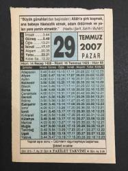 29 TEMMUZ 2007 -TAKVİM YAPRAĞI-DOĞUM GÜNÜ HEDİYESİ-FAZİLET TAKVİMİ,YAPRAK AŞISI SONU,ÜZÜMLERİN OLGUNLAŞMAYA BAŞLAMASI,ŞİDDETLİ SICAKLAR,ANA BABAYA İTAAT