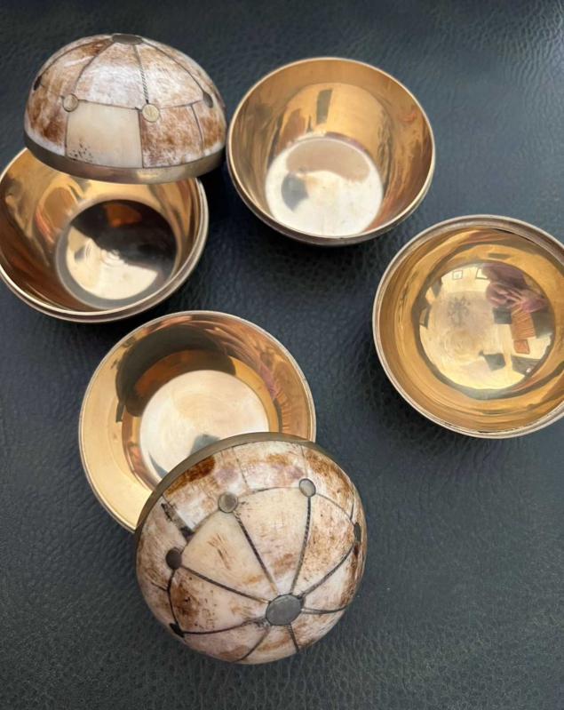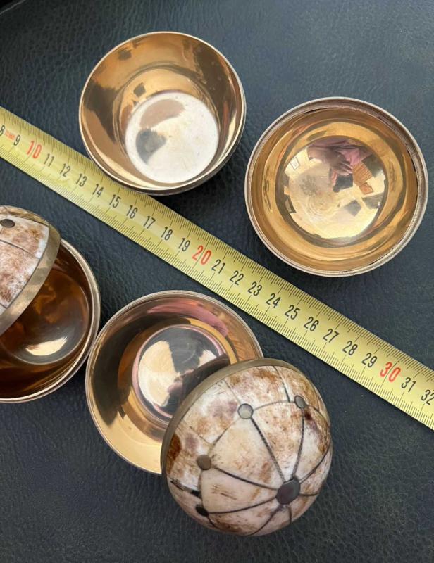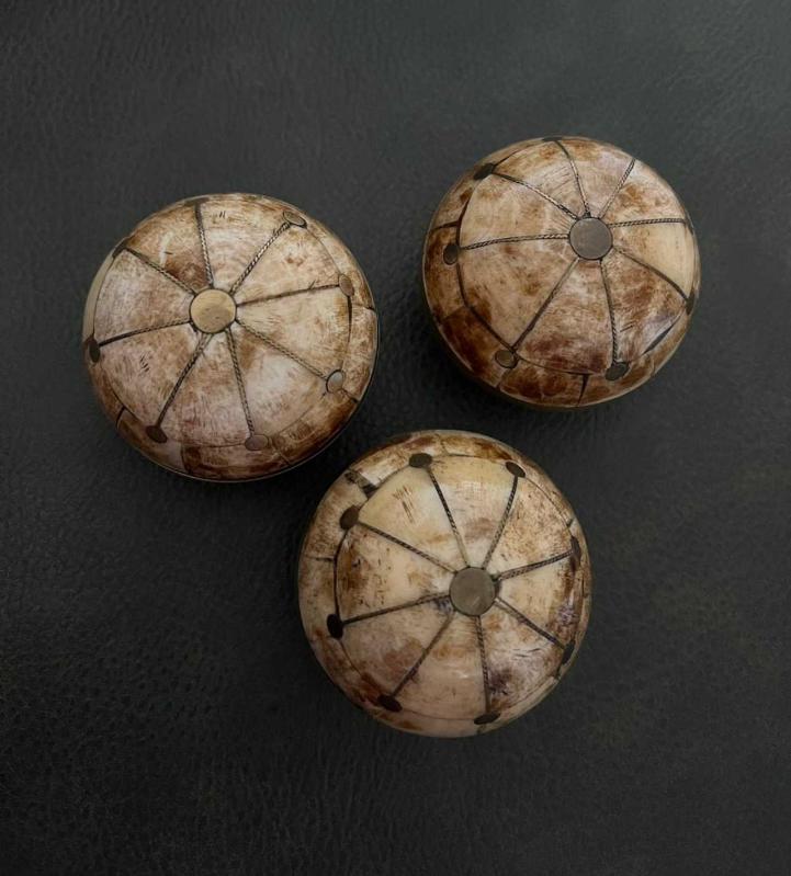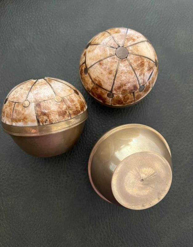 3 adet kapakları pirinç üzeri kemik kaplı, diğer yerleri sadece pirinç olan, 7 cm çapında vidalı kapak pirinç kutular.