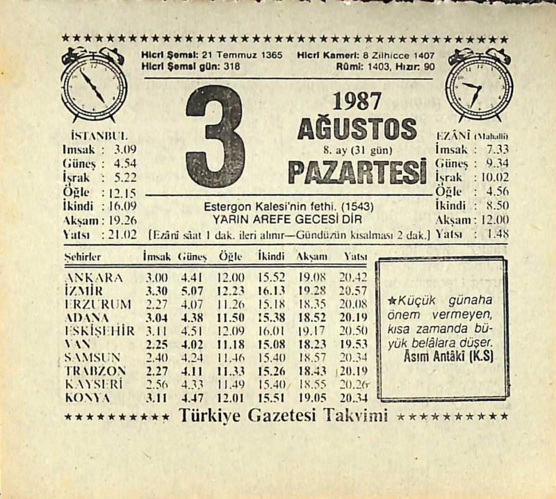 3 Ağustos 1987 Takvim Yaprağı - Doğum Günü Hediyesi EFMN13846, en son 22 gün önce güncellenmiştir.