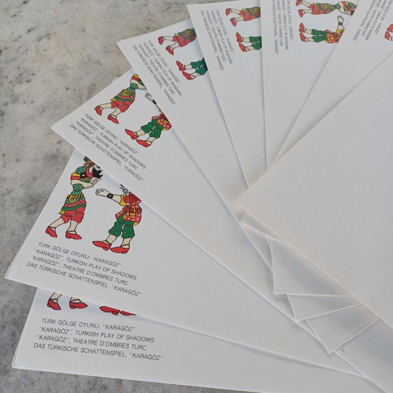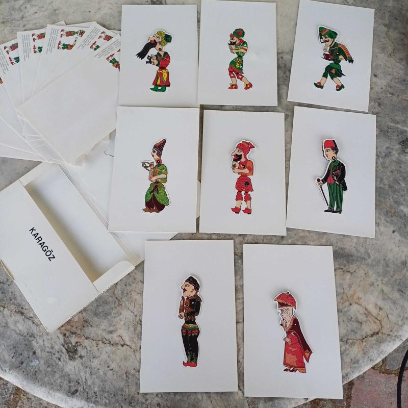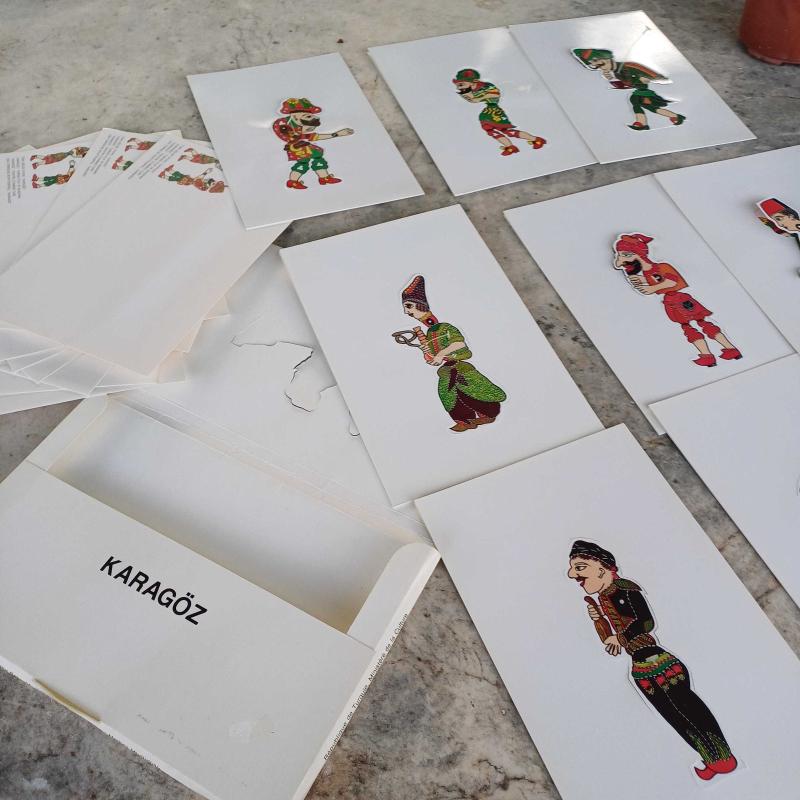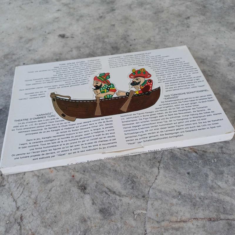 T.C Kultur Bakanliği tarafindan hazirlanmis ve basilmis bir kultur hazinesi. Turk Golge oyunu Karagöz hikayeleri renkli posta kartlari olarak hazirlanmis. Her bir kartta, ddgisik bir golge oyunu figuru ve oyküsu 4 dilde (Turkce,ingilizce,fransizca ve almanca)yazilmis ve hareketli ve 3 boyutlu olarak resmedilmis.(Toplam 8 adet ) Herbiri içn de 8 adet zarfi mevcut. Tamami tek bir ozel karton klifinda toplanmis. Harika bir yayın. Basim yeri Ankara. Periyot reklamcilik tarafindan basilmis. 90'lı yillar. Tertemiz kondisyon. Karton kilifinda ufak yasanmislik izleri mevcut. 25 x 17 cm ebatlarinda. Resmedilen kahramanlar; Celebi Tuzsuz bekir -zenne Karadenizlu-persan Ascibadi- hacivat Eskici