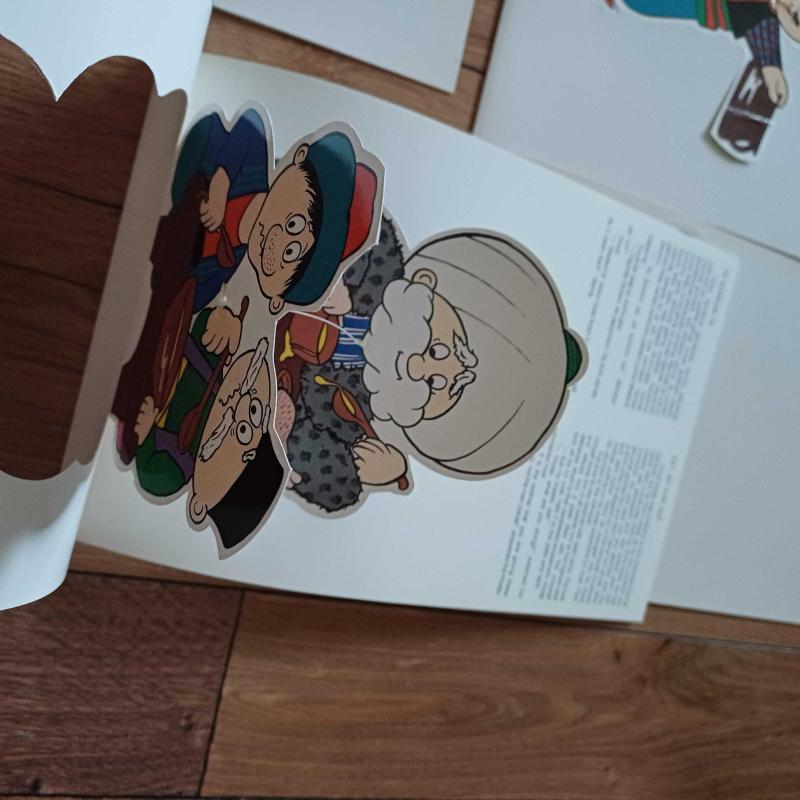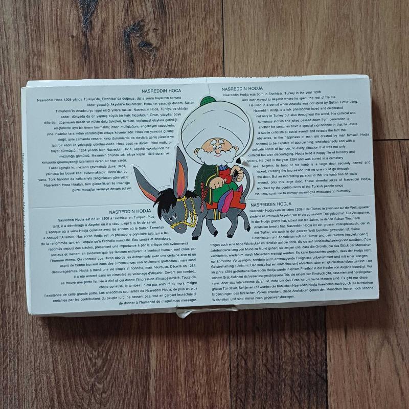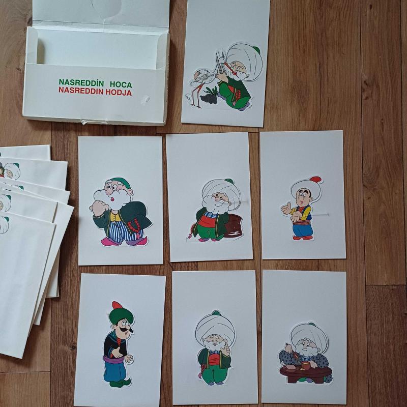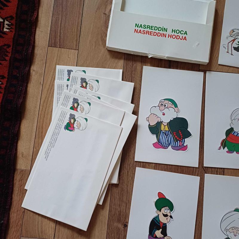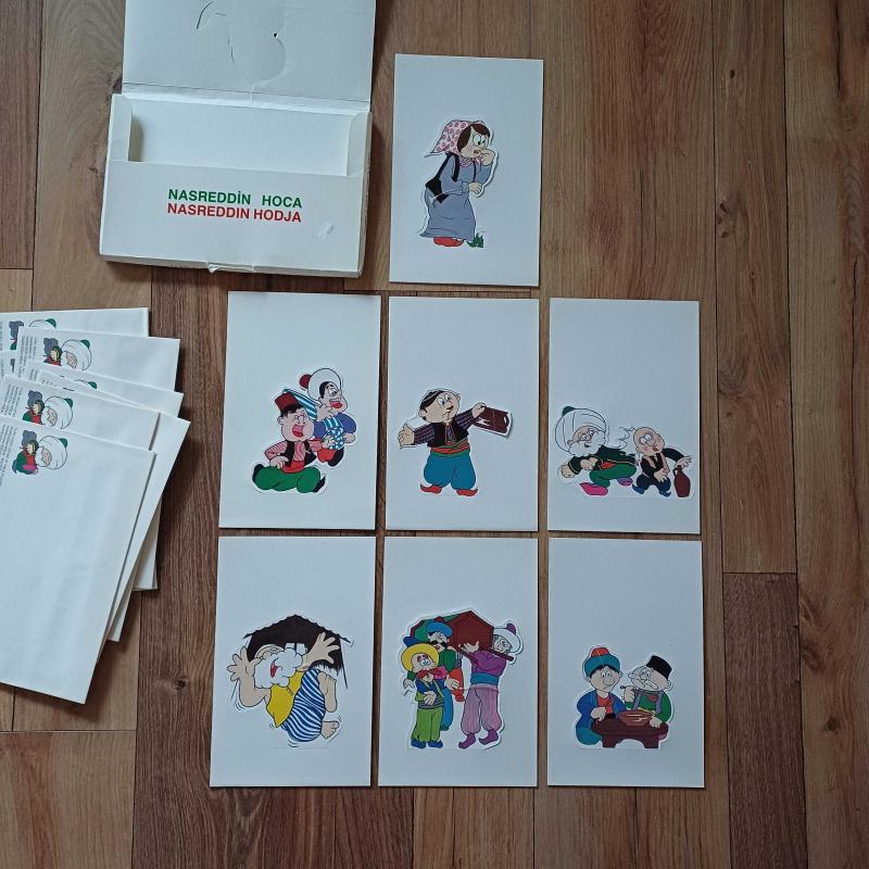 T.C Kultur Bakanliği tarafindan hazirlanmis ve basilmis bir kultur hazinesi. Mizah ustasi ve halk filozofu Nasreddin Hoca hikayeleri renkli posta kartlari olarak hazirlanmis. Her bir kartta,bir adet Nasreddin Hoca oyküsu 4 dilde (Turkce,ingilizce,fransizca ve almanca)yazilmis ve hareketli ve 3 boyutlu olarak resmedilmis.(Toplam 7 adet ) Herbiri jcin de 7 adet zarfi mevcut. Tamami tek bir ozel karton kolifinda toplanmis. Harika bir yayın. Basim yeri Ankara. Periyot reklamcilik tarafindan basilmis. 90'lı yillar. Tertemiz kondisyon. Karton kilifinda ufak yasanmislik izleri mevcut. 25 x 17 cm ebatlarinda. Hikayeler; Ye kurkum ye Tabutun neresinde Yorgan gitti Kazan Onceden testi kirilmasi Kuşa benzedi ve Damdan düsen halden anlar