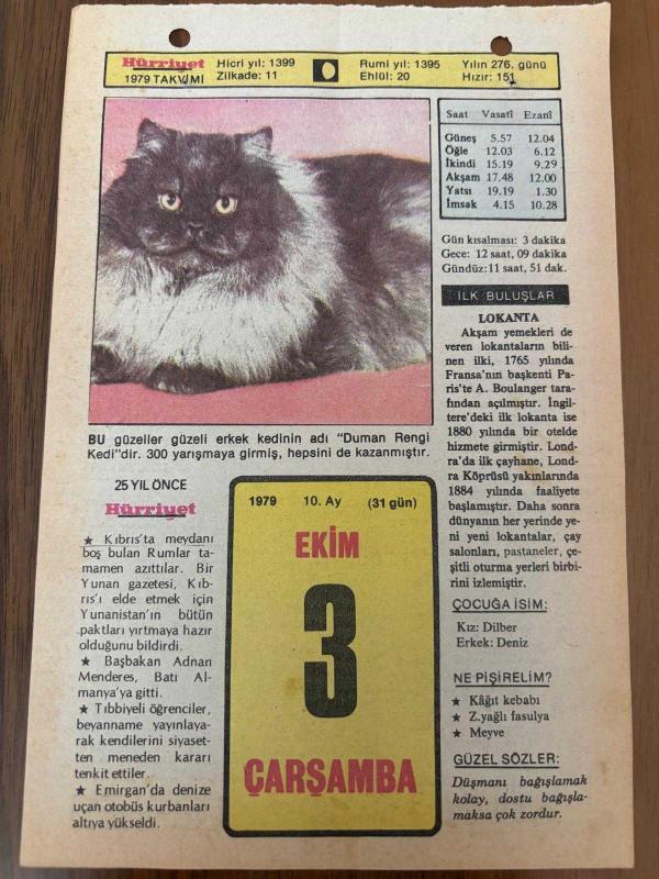 3 EKİM 1979 - TAKVİM YAPRAĞI - DOĞUM GÜNÜ HEDİYESİ - HÜRRİYET TAKVİMİ - PİS BİR İŞ ROMANI - İstanbul Sarayburnu'nda Atatürk heykelinin açılışı (1926) - Mudanya Konferansı (1922) başlıklı ürün, Efemera, Müzik, Sinema > Belge ve Evraklar > Takvimler kategorisi altında İkinci El olarak satılmaktadır.