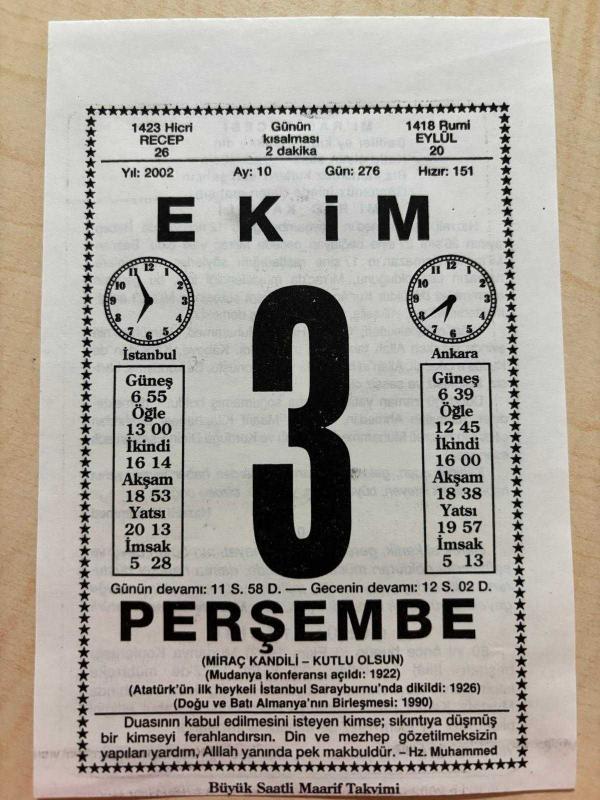 3 EKİM 2002 - TAKVİM YAPRAĞI - DOĞUM GÜNÜ HEDİYESİ - BÜYÜK SAATLİ MAARİF TAKVİMİ - HZ.MUHAMMED - Mİ'RAC GECESİ - MUDANYA KONFERANSI, en son 8 ay önce güncellenmiştir.
