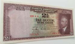 3.EMİSYON 1.TERTİP İNÖNÜ 2,5 İKİ BUÇUK TÜRK LİRASI SERİ A 41 347529 NOLU NATÜREL KAĞIT PARA EN NADİRİ