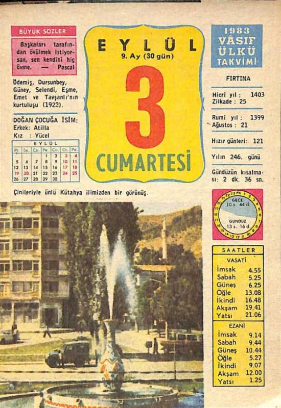3 Eylül 1983 Takvim Yaprağı - Doğum Günü Hediyesi EFM(N)10023, en son 22 gün önce güncellenmiştir.