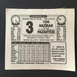 3 HAZİRAN 1996 -TAKVİM YAPRAĞI-DOĞUM GÜNÜ HEDİYESİ-TÜRKİYE GAZETESİ TAKVİMİ,TÜRKÇENİN RESMİ DİL OLARAK KABULÜ 1277,SÜMERBANKIN KURULUŞU 1937,ZAMAN İMKAN MAAŞ, en son 8 ay önce güncellenmiştir.