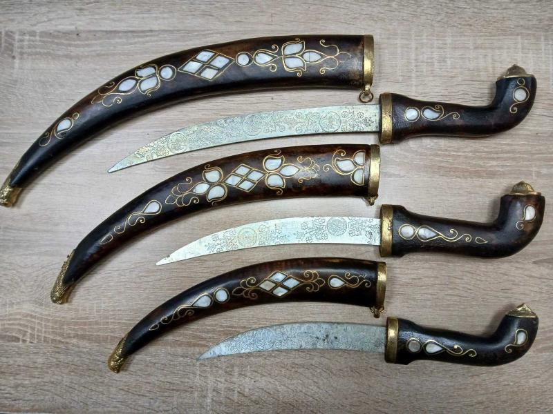 3 LÜ AHŞAP ÜZERİNE SEDEF GİYDİRME, KINI PİRİNÇ UÇLU VE PİRİNÇ KİLİTLEMELİ, İÇ AKSAM ALÜMİNYUM. 1- 60 CM KINI İLE BERABER 2 -55 CM KINI İLE BERABER 3 -50 CM KINI İLE BERABER SÜS VE DEKOR AMAÇLIDIR.