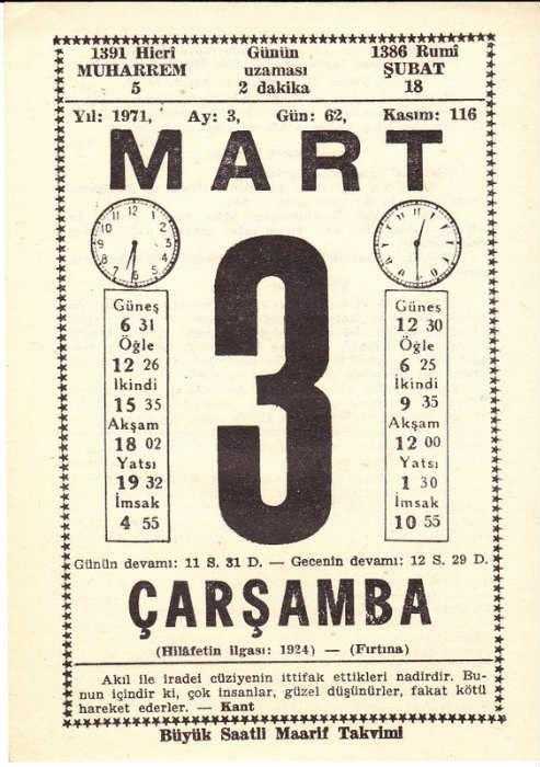 3 MART 1971 SAATLİ MAARİF TAKVİMİ YAPRAĞI, 5 yıl önce satışa sunulmuştur.