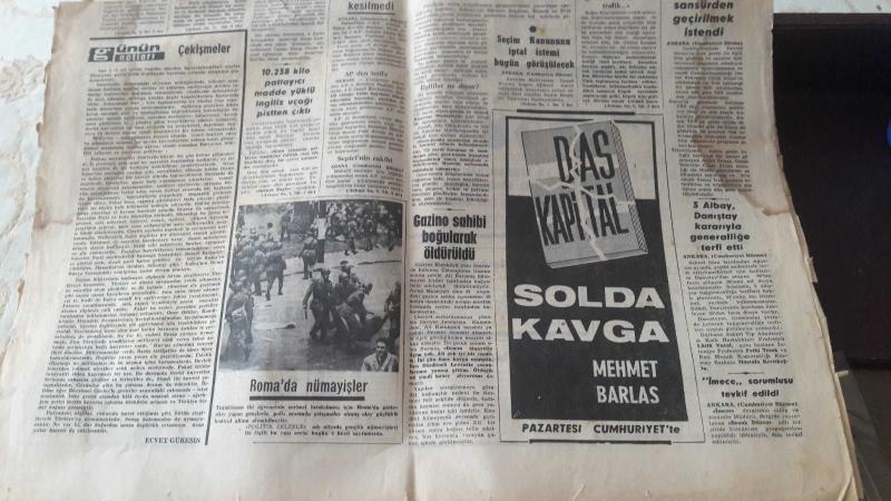 3 MAYIS 1965 CUMHURİYET GAZETESİ manşet sayfası . Boğaz köprüsü konusu tartışıldı. Ankarada gecekondu yapımı hızlandı. Abd. Kalp nakli yapıldı. Hükümetin irticaı kullanmamasını istiyorum adlı eser Türkçe dilindedir.