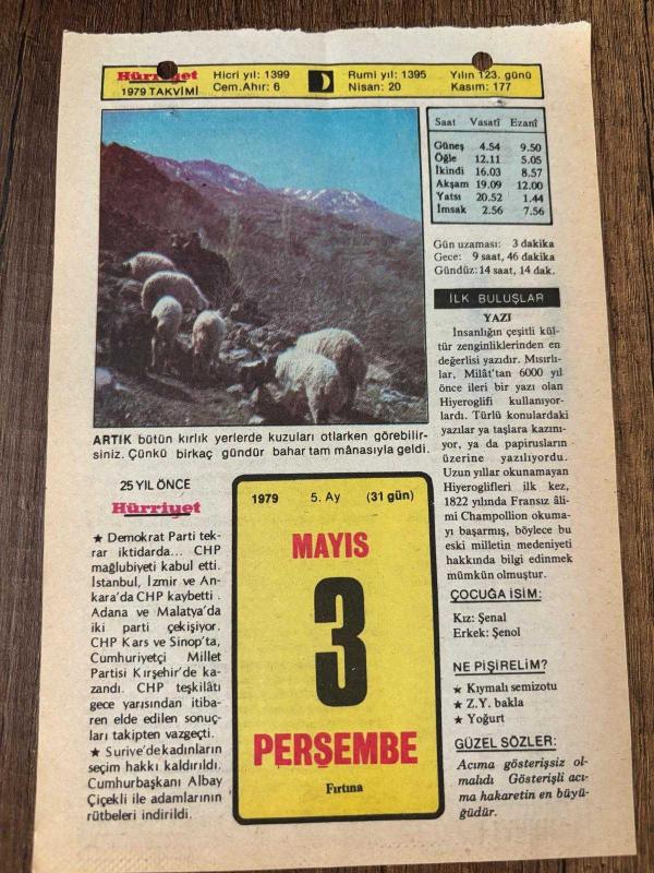 3 MAYIS 1979 - TAKVİM YAPRAĞI - DOĞUM GÜNÜ HEDİYESİ - HÜRRİYET TAKVİMİ - ÖLÜM TANRISI ROMANI - Hürriyet yazarı ve Senatör Ecvet Güresin'in ölümü (1975) - Yazar Abdülhak Şinası Hisar'ın ölümü (1963) - Türk Kuşu'nun kuruluşu (1935) - Fatih Sultan Mehmet'in ölümü (1481), en son 8 ay önce güncellenmiştir.