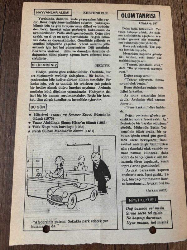 3 MAYIS 1979 - TAKVİM YAPRAĞI - DOĞUM GÜNÜ HEDİYESİ - HÜRRİYET TAKVİMİ - ÖLÜM TANRISI ROMANI - Hürriyet yazarı ve Senatör Ecvet Güresin'in ölümü (1975) - Yazar Abdülhak Şinası Hisar'ın ölümü (1963) - Türk Kuşu'nun kuruluşu (1935) - Fatih Sultan Mehmet'in ölümü (1481) başlıklı ürün, Efemera, Müzik, Sinema > Belge ve Evraklar > Takvimler kategorisi altında İkinci El olarak satılmaktadır.