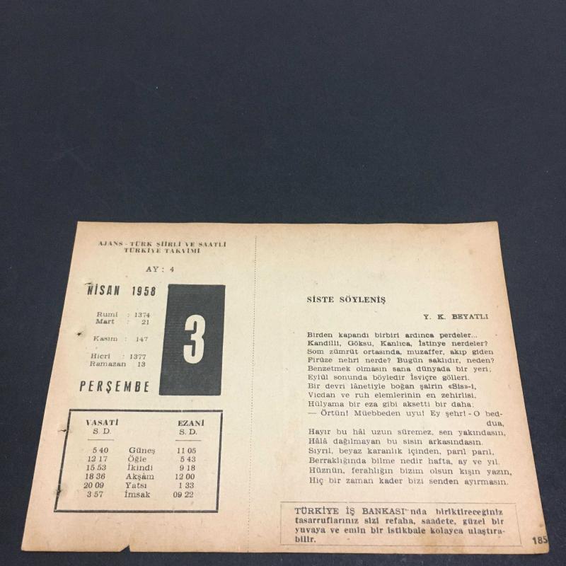3 NİSAN 1958 -TAKVİM YAPRAĞI-DOĞUM GÜNÜ HEDİYESİ- AJANS-TÜRK ŞİİRLİ VE SAATLİ TÜRKİYE TAKVİMİ,Y.K.BEYATLI,CEMAL YEŞİL,FAL,FIKRA,KOCA SİNAN PAŞANIN ÖLÜMÜ 1596,JOHANNES BRAHMS IN ÖLÜMÜ 1897,GÜZEL SÖZ,YEMEK LİSTESİ, 1 yıl önce satışa sunulmuştur.