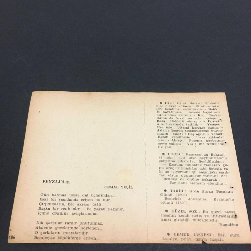3 NİSAN 1958 -TAKVİM YAPRAĞI-DOĞUM GÜNÜ HEDİYESİ- AJANS-TÜRK ŞİİRLİ VE SAATLİ TÜRKİYE TAKVİMİ,Y.K.BEYATLI,CEMAL YEŞİL,FAL,FIKRA,KOCA SİNAN PAŞANIN ÖLÜMÜ 1596,JOHANNES BRAHMS IN ÖLÜMÜ 1897,GÜZEL SÖZ,YEMEK LİSTESİ başlıklı ürün, Efemera, Müzik, Sinema > Belge ve Evraklar > Takvimler kategorisi altında İkinci El olarak satılmaktadır.