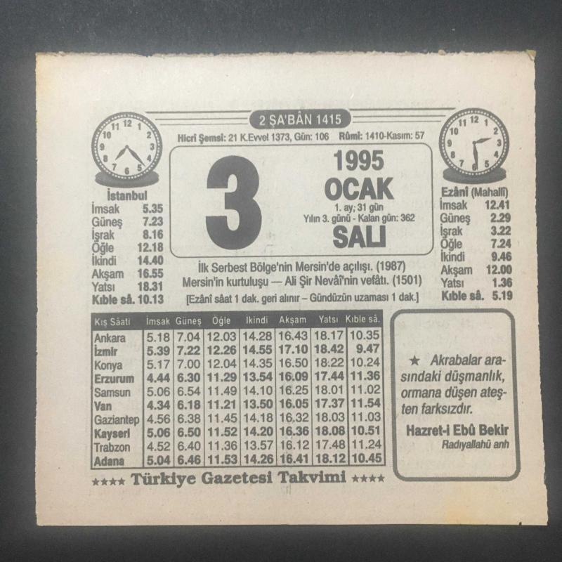 3 OCAK 1995 -TAKVİM YAPRAĞI-DOĞUM GÜNÜ HEDİYESİ-TÜRKİYE GAZETESİ TAKVİMİ,İLK SERBEST BÖLGENİN MERSİNDE AÇILIŞI 1987,MERSİNİN KURTULUŞU,ALİ ŞAİR NEVAİNİN VEFATI 1501,İMANIN ŞARTLARI,BALIK YAĞI, başlıklı ürün, Efemera, Müzik, Sinema > Belge ve Evraklar > Takvimler kategorisi altında İkinci El olarak satılmaktadır.