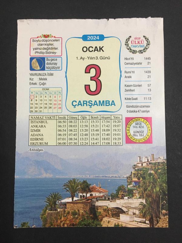 3 OCAK 2024 -TAKVİM YAPRAĞI-DOĞUM GÜNÜ HEDİYESİ-VASIF ÜLKÜ TAKVİMİ,ANTALYA,MERSİN İNGİLİZ İŞGALİNDEN KURTULDU 1922,ALASKA ,ABD TARAFINDAN RUSYADAN SATIN ALINDI,1959,İMKB AÇILDI 1986,KAMU KURUM VE KURULUŞLARINDA ÇALIŞAN KADINLARIN PANTOLON GİYİNEBİLMESİNE OLANAK TANINDI 2002,YAĞMUR SORUNU,PAPATYA,FIRINDA BROKOLİ,YAVRUNUZA İSİM