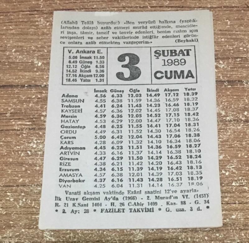3 ŞUBAT 1989 CUMA ( Fazilet Takvimi Yaprağı ) başlıklı ürün, Efemera, Müzik, Sinema > Belge ve Evraklar > Takvimler kategorisi altında İkinci El olarak satılmaktadır.