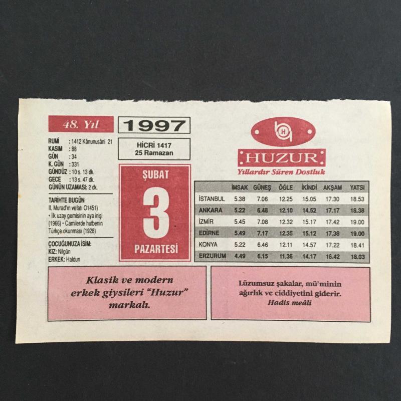 3 ŞUBAT 1997-TAKVİM YAPRAĞI-DOĞUM GÜNÜ HEDİYESİ-HUZUR TAKVİMİ,2.MURADIN VEFATI,1451,İLK UZAY GEMİSİNİN AYA İNİŞİ,1966,CAMİLERDE HUTBENİN TÜRKÇE OKUNMASI 1928,ÇOCUĞUNUZA İSİM,ÖFKEYİ EVE TAŞIMAMAK,ALLAHA MUHABBETİN ALEMETLERİ