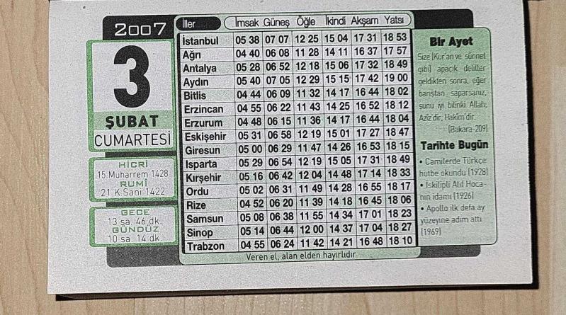 3 ŞUBAT 2007 CUMARTESİ - TAKVİM YAPRAĞI - DOĞUM GÜNÜ HEDİYESİ - TÜRMATSAN TAKVİMİ - CAMİLERDE TÜRKÇE HUTBE OKUNDU (1928)- İSKİLİPLİ ATIF HOCANIN İDAMI (1926)- APOLLO İLK DEFA AY YÜZEYİNE ADIM ATTI (1969)- KADIN, en son 2 ay önce güncellenmiştir.