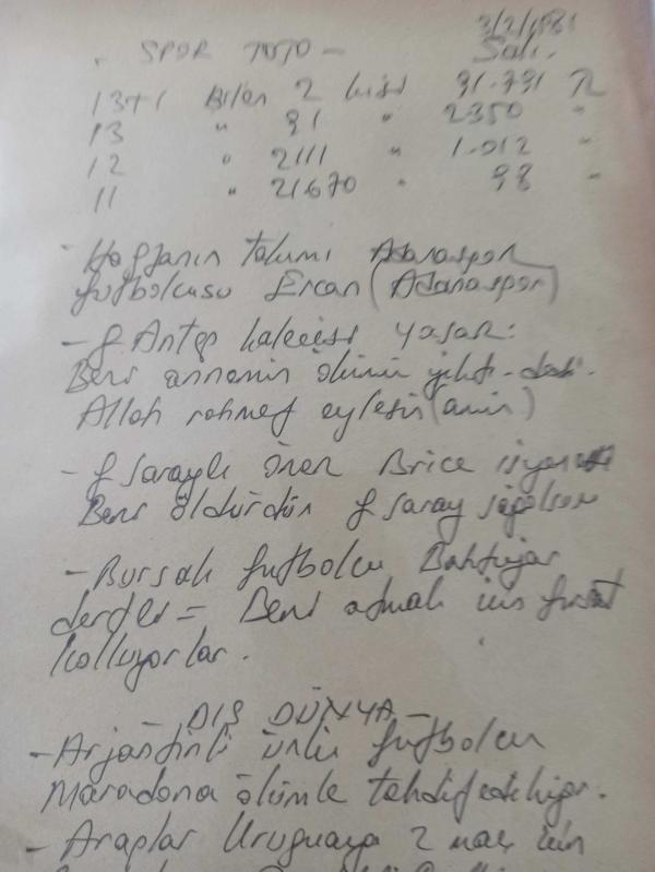 3 Şubat 1981 - Fenerbahçeli Erol soyunma odasında ayağına masaj yaptırıyor - Spor Toto Sonuçları - Haftanın Takımı Adanaspor - Gaziantep kalecisi Yaşar: ''Beni annemin ölümü yıktı'' dedi - Allah rahmet eylesin haberi - Islak kalemle a4 kağıdına yazılmış bilgi notu - Tek Yaprak Arkalı Önlüdür adlı eser, Kitap > Süreli Yayınlar > Dergiler > Spor kategorisinde İkinci El olarak satıştadır.