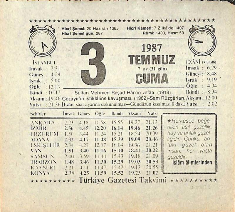 3 Temmuz 1987 Takvim Yaprağı - Doğum Günü Hediyesi EFMN13815, en son 22 gün önce güncellenmiştir.