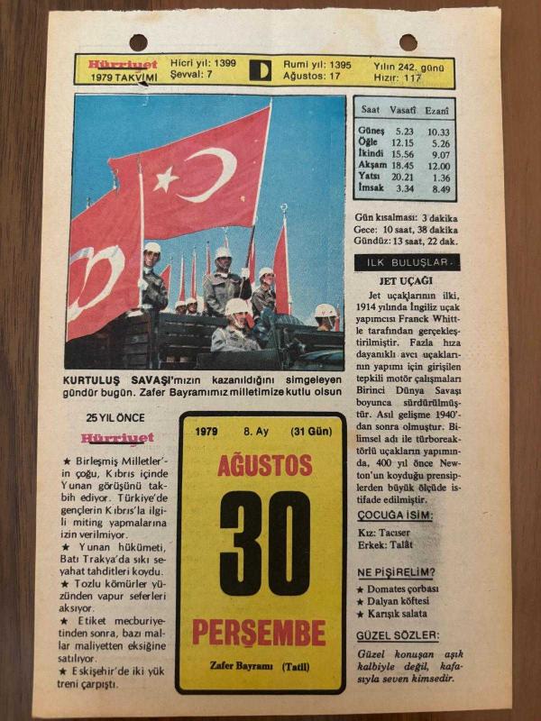 30 AĞUSTOS 1979 - TAKVİM YAPRAĞI - DOĞUM GÜNÜ HEDİYESİ - HÜRRİYET TAKVİMİ - PİS BİR İŞ ROMANI - Büyük Taarruz'un zaferle sonuçlanması (1922) - Ressam Namık İsmail'in ölümü (1935) - Ankara-Kayseri Demiryolunun açılışı (1930), en son 8 ay önce güncellenmiştir.