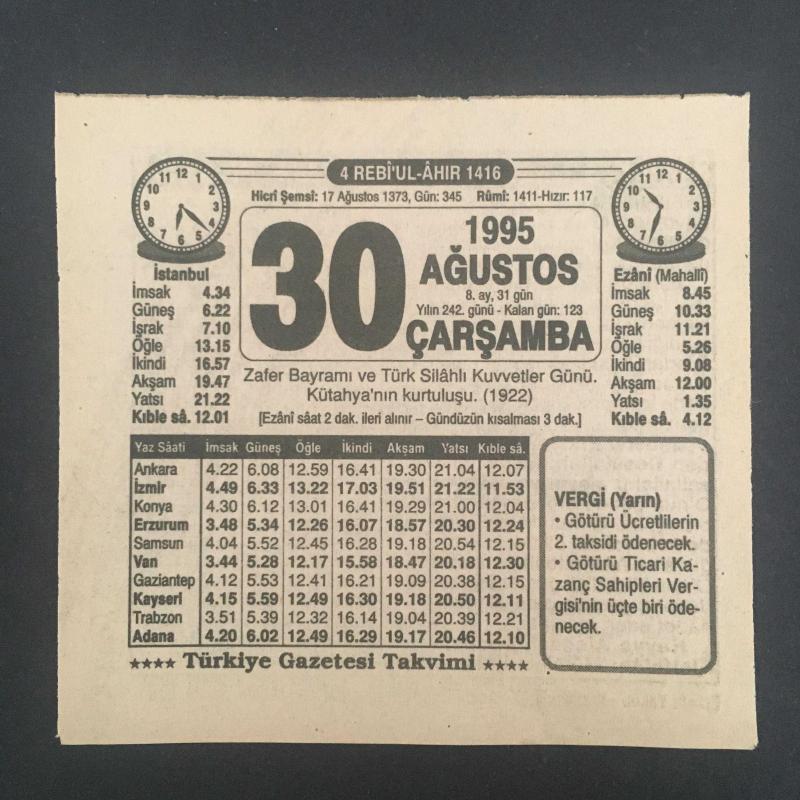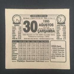 30 AĞUSTOS 1995 -TAKVİM YAPRAĞI-DOĞUM GÜNÜ HEDİYESİ-TÜRKİYE GAZETESİ TAKVİMİ,ZAFER BAYRAMI VE TÜRK SİLAHLI KUVVETLER GÜNÜ ,KÜTAHYANIN KURTULUŞU 1922,30 AĞUSTOS,DOMATES DOLMASI,MUMYA başlıklı ürün, Efemera, Müzik, Sinema > Belge ve Evraklar > Takvimler kategorisi altında İkinci El olarak satılmaktadır.