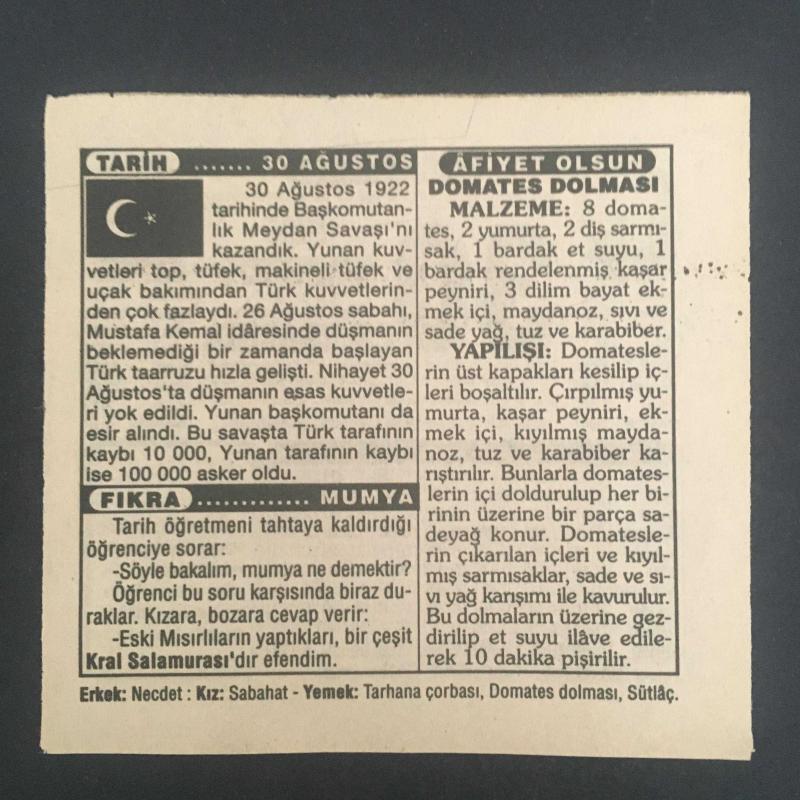 30 AĞUSTOS 1995 -TAKVİM YAPRAĞI-DOĞUM GÜNÜ HEDİYESİ-TÜRKİYE GAZETESİ TAKVİMİ,ZAFER BAYRAMI VE TÜRK SİLAHLI KUVVETLER GÜNÜ ,KÜTAHYANIN KURTULUŞU 1922,30 AĞUSTOS,DOMATES DOLMASI,MUMYA, en son 8 ay önce güncellenmiştir.