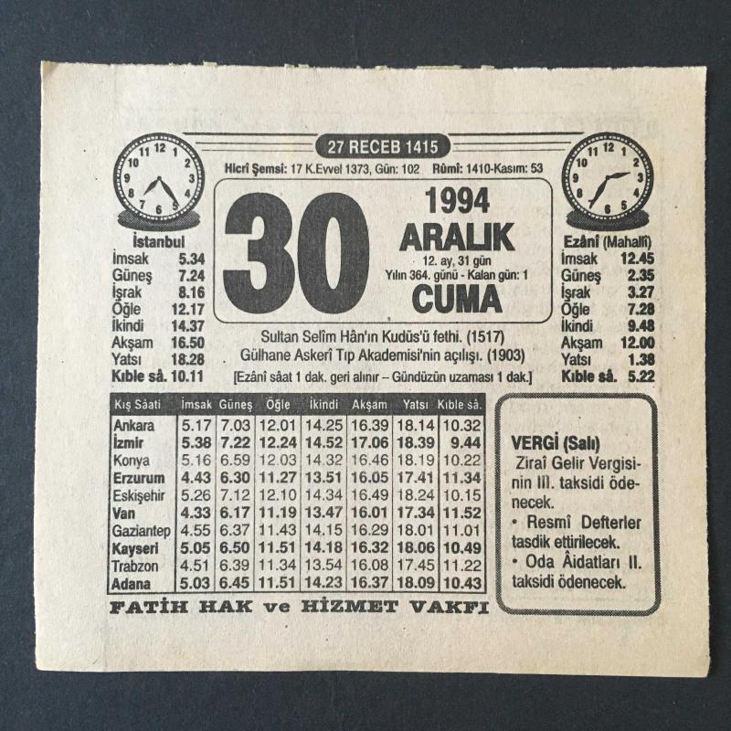 30 ARALIK 1994 -TAKVİM YAPRAĞI-DOĞUM GÜNÜ HEDİYESİ-FATİH HAK VE HİZMET VAKFI TAKVİMİ,SULTAN SELİMİN KUDÜSÜ FETHİ 1517,GÜLHANE ASKERİ TIP AKADEMİSİNİN AÇILIŞI 1903,DUANIN EDEBLERİ başlıklı ürün, Efemera, Müzik, Sinema > Belge ve Evraklar > Takvimler kategorisi altında İkinci El olarak satılmaktadır.