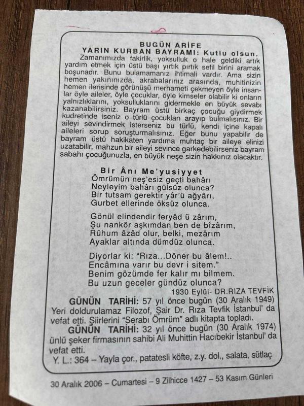 30 ARALIK 2006 - TAKVİM YAPRAĞI - DOĞUM GÜNÜ HEDİYESİ - BÜYÜK SAATLİ MAARİF TAKVİMİ - BAKARA SURESİ - BUGÜN ARİFE - DR. RIZA TEVFİK VEFAT ETTİ - ALİ MUHİTTİN HACIBEKİR VEFAT ETTİ, 4 ay önce satışa sunulmuştur.