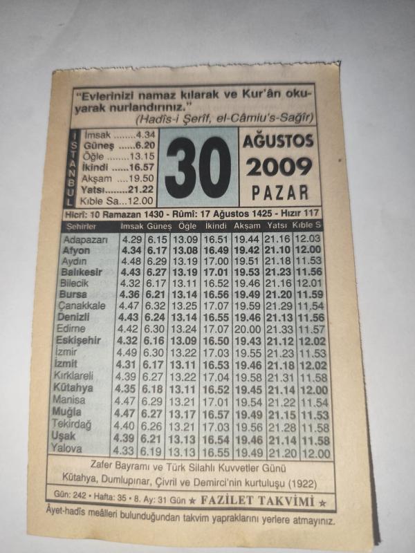 30 Ağustos 2009-Orijinal Takvim Yaprağı-Doğum Günü-Söz,Nişan,Nikâh,Düğün ve Önemli Günler Hediyesi-Fazilet Takvimi-Ayet(Hadis)(Hadis-i Şerif, el-Camiu's-Sağir)-Zafer bayramı Ve Türk Silahli Kuvvetler Günü Kütahya Dumlpupınar,Çivril Ve Demirci'nin Kurtuluşu (1922)-Eyyüb Aleyhisselam, en son 24 gün önce güncellenmiştir.