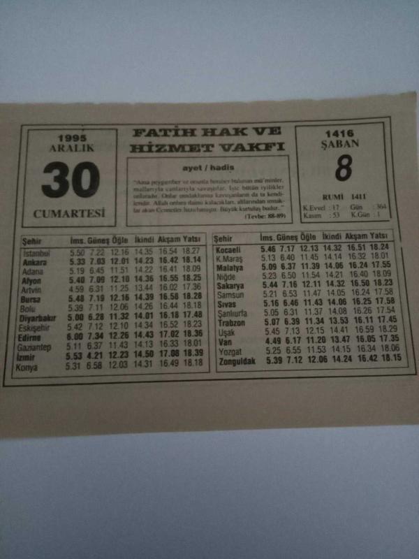 30 Aralık 1995-Orijinal Takvim Yaprağı-Doğum Günü-Söz,Nişan,Nikâh,Düğün ve Önemli Günler Hediyesi-Fatih Hak ve Hizmet Vakfı-Ayet/Hadis(Tevbe:88-89)-Akif'in Bu Yönlerini Bilir Miydiniz?-Veysel Karani-Hazır Çorbayı Lezzetlendirin başlıklı ürün, Efemera, Müzik, Sinema > Belge ve Evraklar > Takvimler kategorisi altında İkinci El olarak satılmaktadır.
