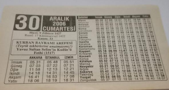 30 Aralık 2006-Orijinal Takvim Yaprağı-Doğum Günü-Söz,Nişan,Nikâh,Düğün ve Önemli Günler Hediyesi-ERAŞ Hizmet Takvimi-Ayet-Hadis(Kurban Bayramı Arefesi)-Kurbanın Bedelini Vermek-Kurban Etinin Taksimi-Çocuğunuza İsim:Fatih,Feyza, en son 3 ay önce güncellenmiştir.