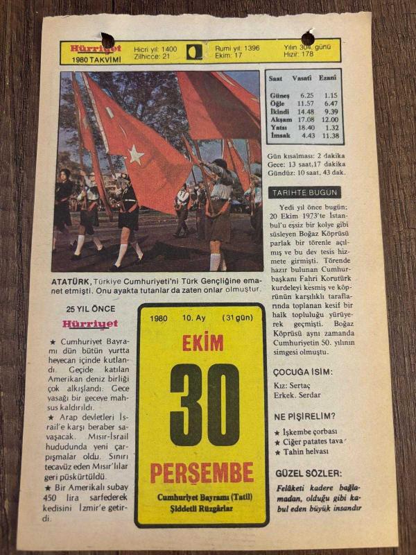 30 EKİM 1980 - TAKVİM YAPRAĞI - DOĞUM GÜNÜ HEDİYESİ - HÜRRİYET TAKVİMİ - ESKİ BİR ŞARKI ADLI ROMAN - Boğaziçi Köprüsü'nün açılışı (1973) - Mondros Antlaşması (1918), en son 7 ay önce güncellenmiştir.