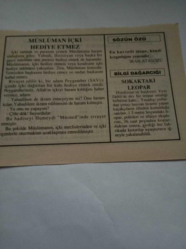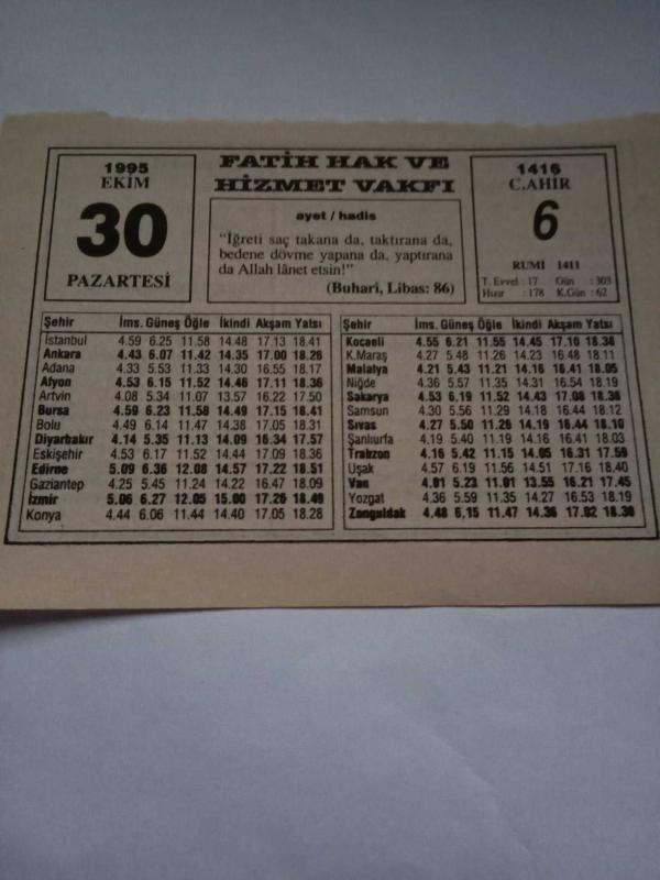 30 Ekim 1995-Orijinal Takvim Yaprağı-Doğum Günü-Söz,Nişan,Nikâh,Düğün ve Önemli Günler Hediyesi-Fatih Hak ve Hizmet Vakfı-Ayet/Hadis(Buharî,Libas:86)-Müslüman İçki Hediye Etmez-İran Atasözü-Sokaktaki Leopar başlıklı ürün, Efemera, Müzik, Sinema > Belge ve Evraklar > Takvimler kategorisi altında İkinci El olarak satılmaktadır.