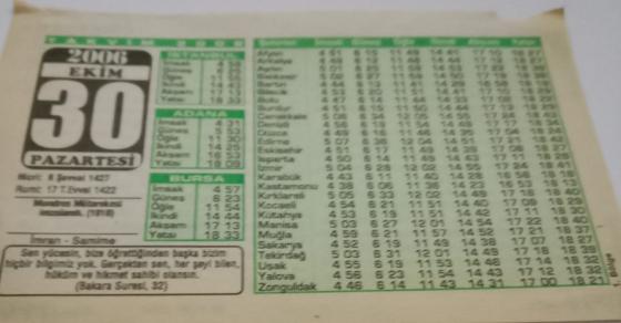 30 Ekim 2006-Orijinal Takvim Yaprağı-Doğum Günü-Söz,Nişan,Nikâh,Düğün ve Önemli Günler Hediyesi-Bizim Anadolu Takvimleri-Ayet(Bakara Suresi,32)-Mondros Mütarekesi imzalandı(1918)-İmran,Samime-Esma'ul-Hüsna, en son bir ay önce güncellenmiştir.