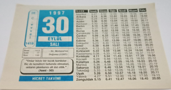 30 Eylül 1997-Orijinal Takvim Yaprağı-Doğum Günü-Söz,Nişan,Nikâh,Düğün ve Önemli Günler Hediyesi-Hicret Takvimi-Ayet(Hadis)(Nemi-50)-Hz.Mevlana'nın Doğumu(1207)-Kötülüğe Kötülükle Muamele-Zindanı Gülizar Etmek-Necmettin Erbakan başlıklı ürün, Efemera, Müzik, Sinema > Belge ve Evraklar > Takvimler kategorisi altında İkinci El olarak satılmaktadır.