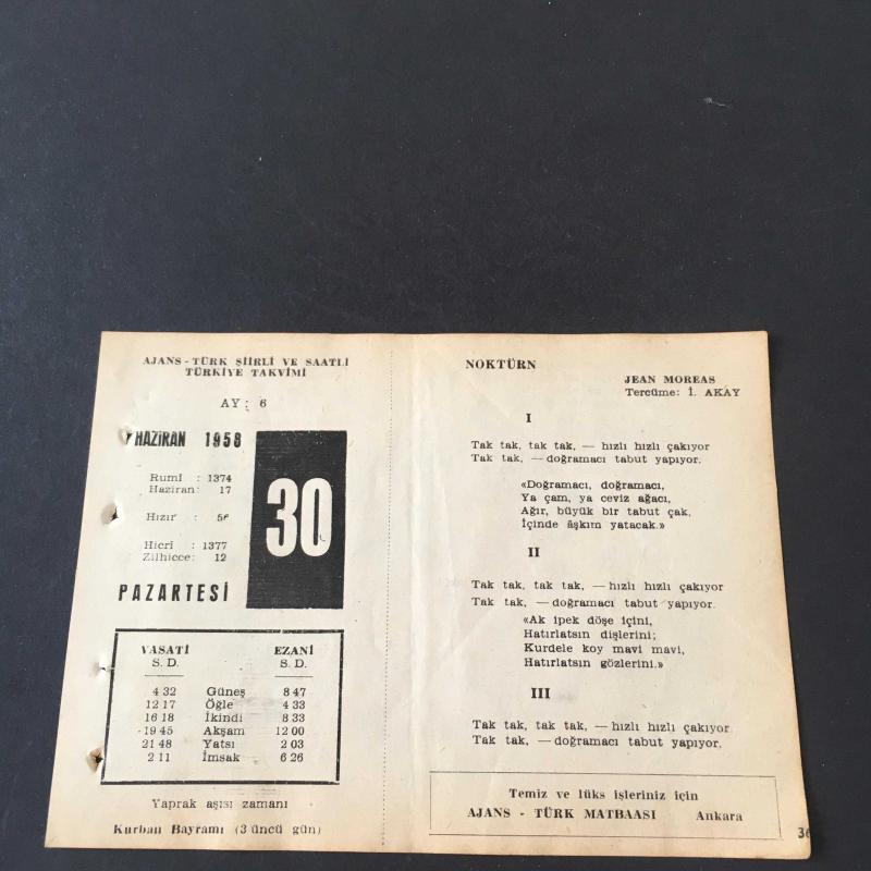 30 HAZİRAN 1958 -TAKVİM YAPRAĞI-DOĞUM GÜNÜ HEDİYESİ-AJANS-TÜRK ŞİİRLİ VE SAATLİ TÜRKİYE TAKVİMİ,JEAN MOREAS,FAL,FIKRA,2.BALKAN HARBİ 1913,GÜZEL SÖZ,YEMEK LİSTESİ başlıklı ürün, Efemera, Müzik, Sinema > Belge ve Evraklar > Takvimler kategorisi altında İkinci El olarak satılmaktadır.