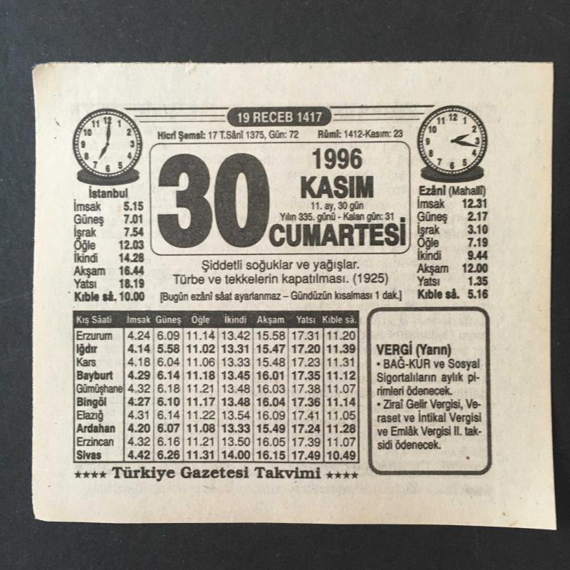 30 KASIM 1996 -TAKVİM YAPRAĞI-DOĞUM GÜNÜ HEDİYESİ-TÜRKİYE GAZETESİ TAKVİMİ,ŞİDDETLİ SOĞUKLAR VE YAĞIŞLAR,TÜRBE VE TEKKELRİN KAPATILMASI 1925,AKIBETİMİZ NE OLACAK