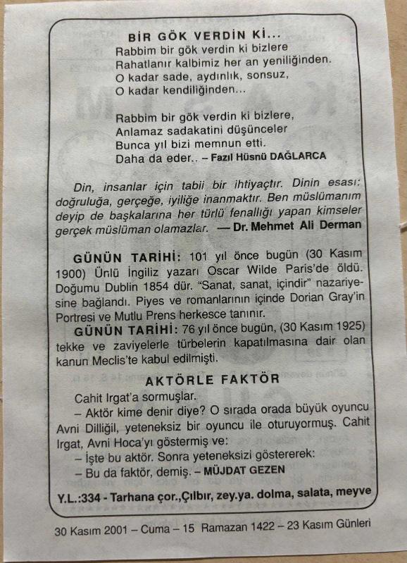 30 KASIM 2001 - TAKVİM YAPRAĞI - DOĞUM GÜNÜ HEDİYESİ - BÜYÜK SAATLİ MAARİF TAKVİMİ - TOKTAMIŞ ATEŞ - FAZIL HÜSNÜ DAĞLARCA - DR. MEHMET ALİ DERMAN - İNGİLİZ YAZAR OSCAR WİLDE ÖLDÜ - TEKKE VE ZAVİYELERİN KAPATILMASINA İLGİLİ KARAR ÇIKTI - AKTÖRLE FAKTÖR ADLI YAZI, en son 8 ay önce güncellenmiştir.