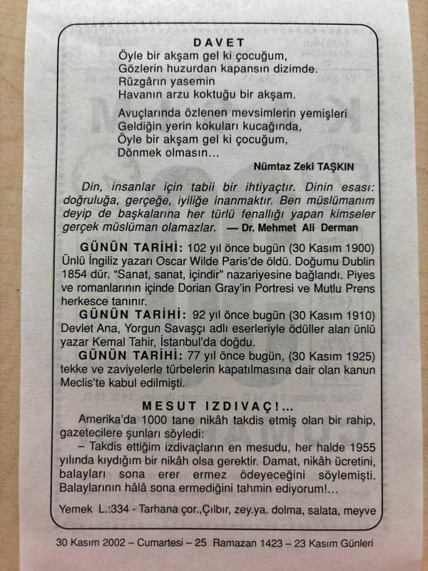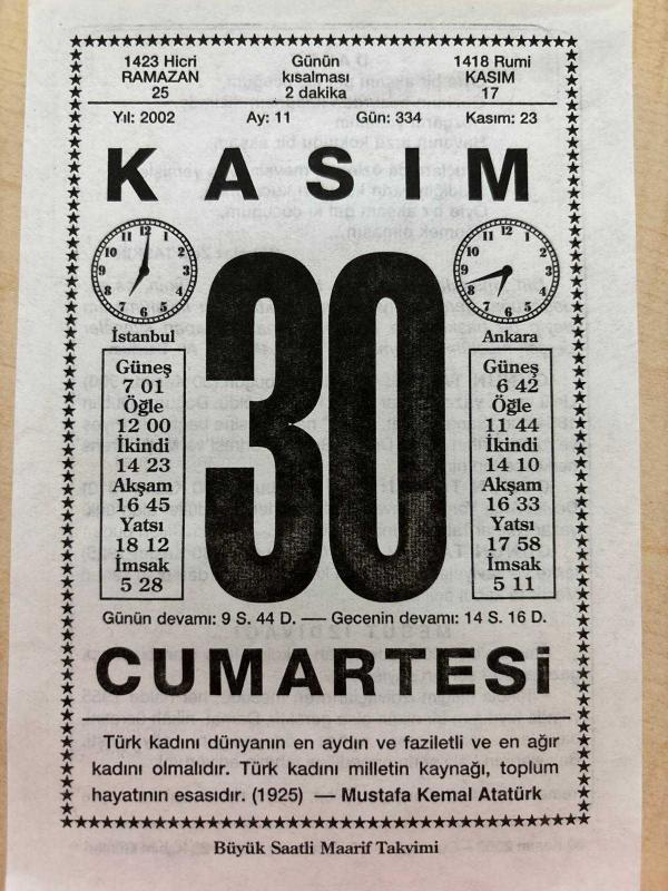 30 KASIM 2002 - TAKVİM YAPRAĞI - DOĞUM GÜNÜ HEDİYESİ - BÜYÜK SAATLİ MAARİF TAKVİMİ - MUSTAFA KEMAL ATATÜRK - MÜMTAZ ZEKİ TAŞKIN - DR. MEHMET ALİ DERMAN - İNGİLİZ YAZAR OSCAR WİLDE ÖLDÜ - TEKKE VE ZAVİYELERİN KAPATILMASINA İLGİLİ KARAR ÇIKTI - YAZAR KEMAL TAHİR'İN DOĞUMU - MESUT IZDIVAÇ ADLI YAZI, en son 8 ay önce güncellenmiştir.