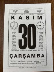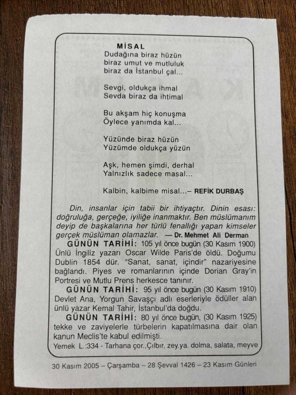 30 KASIM 2005 - TAKVİM YAPRAĞI - DOĞUM GÜNÜ HEDİYESİ - BÜYÜK SAATLİ MAARİF TAKVİMİ - GOETHE - REFİK DURBAŞ - DR. MEHMET ALİ DERMAN - İNGİLİZ YAZAR OSCAR WİLDE ÖLDÜ - TEKKE VE ZAVİYELERİN KAPATILMASINA İLGİLİ KARAR ÇIKTI - YAZAR KEMAL TAHİR'İN DOĞUMU başlıklı ürün, Efemera, Müzik, Sinema > Belge ve Evraklar > Takvimler kategorisi altında İkinci El olarak satılmaktadır.