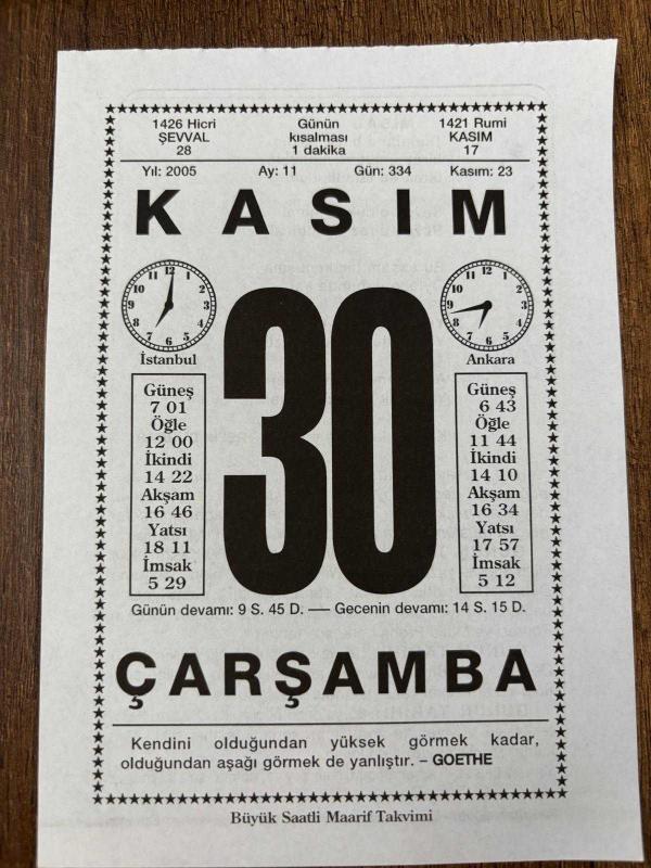 30 KASIM 2005 - TAKVİM YAPRAĞI - DOĞUM GÜNÜ HEDİYESİ - BÜYÜK SAATLİ MAARİF TAKVİMİ - GOETHE - REFİK DURBAŞ - DR. MEHMET ALİ DERMAN - İNGİLİZ YAZAR OSCAR WİLDE ÖLDÜ - TEKKE VE ZAVİYELERİN KAPATILMASINA İLGİLİ KARAR ÇIKTI - YAZAR KEMAL TAHİR'İN DOĞUMU, en son 8 ay önce güncellenmiştir.