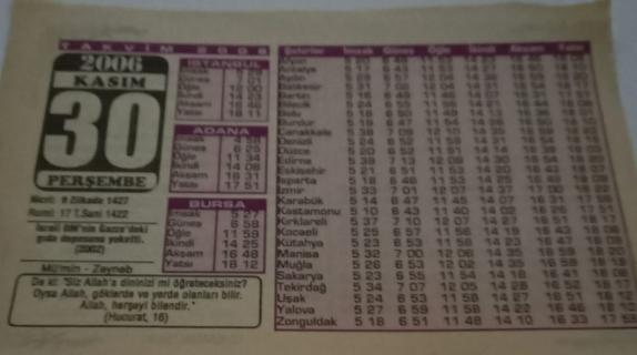 30 Kasım 2006-Orijinal Takvim Yaprağı-Doğum Günü-Söz,Nişan,Nikâh,Düğün ve Önemli Günler Hediyesi-Bizim Anadolu Takvimleri-Ayet(Hucurat:16)-İsrail BM'nin Gazze'deki gıda deposunu yoketti(2002)-Mü'min,Zeyneb-Başarı İçin, en son 2 ay önce güncellenmiştir.